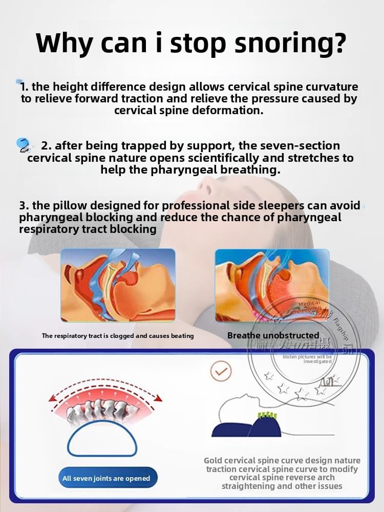 2. Se adapta con precisión a las curvas del cuello y la cabeza humanos, lo que ayuda a ajustar la postura de la cabeza y el cuello durante el sueño, abre las vías respiratorias y reduce los ronquidos causados por la obstrucción de las mismas.